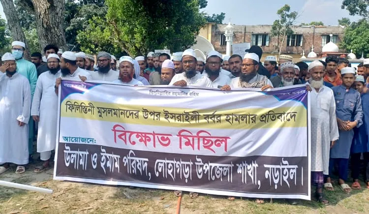 ফিলিস্তিনী মুসলমানদের উপর ইসরাইলী বর্বর হামলার প্রতিবাদে লোহাগড়া উপজেলা উলামা ও ইমাম পরিষদের উদ্যোগে বিক্ষোভ মিছিল ও সমাবেশ অনুষ্ঠিত হয়েছে। সোমবার (১৬অক্টোবর) বিক্ষোভ মিছিলটি জয়পুর ঈদগাহের সামনে থেকে শুরু হয়ে শহরের প্রধান প্রধান সড়ক প্রদক্ষিণ করে উপজেলা পরিষদের সামনে এসে শেষ হয়।