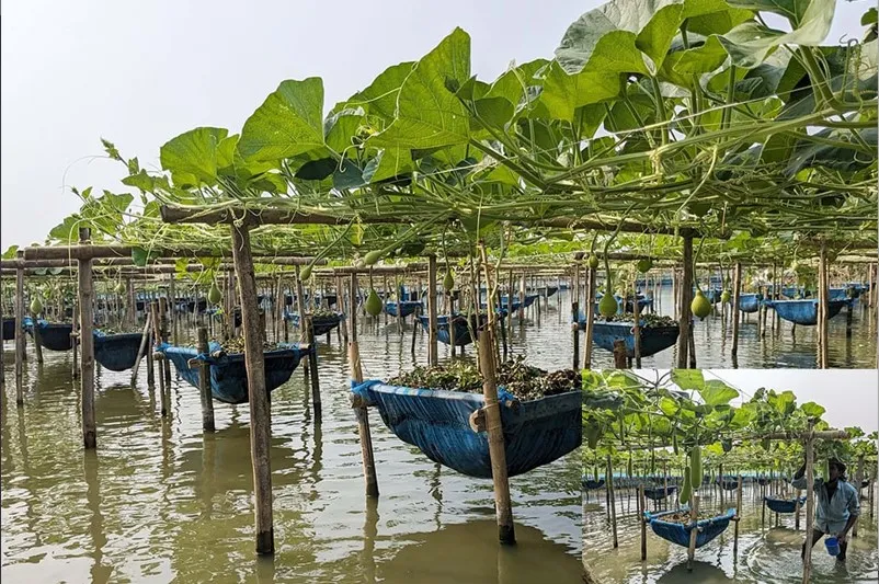 শুক্রবার সরেজমিনে গিয়ে দেখা যায়, পানির ওপর বাঁশের খুঁটির ওপরে নাইলন সুতা দিয়ে মাচা তৈরি করে নিচে ছোট বাঁশের খুঁটির উপর নেট দিয়ে তৈরি ডালি বসানো হয়েছে। এসব ডালিতে টোপাপানা দিয়ে তৈরি কম্পোস্ট সার ও অল্প পরিমাণে মাটি দিয়ে তাতে বীজ রোপণ করা হয়েছে। সেখান থেকে জন্মানো গাছগুলো নাইলনের মাচার উপরে উঠে গেছে। সেসব গাছে থরে থরে ঝুলছে লাউ, কুমড়া, ঝিঙ্গেসহ নানান সবজি। নতুন এ পদ্ধতিতে চাষ দেখতে প্রতিনিয়ত আসছেন এলাকার কৃষকরা।