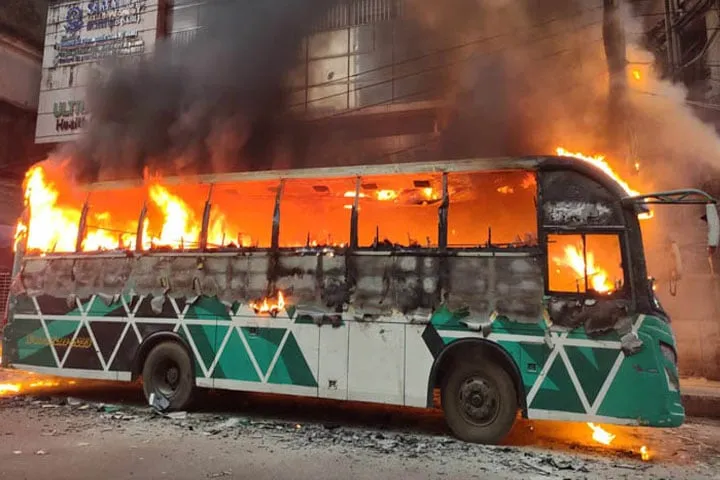 এদিকে, বিজয়নগরের নাইটিংগেল মোড়ে রাস্তার পাশে দাঁড়িয়ে থাকা একটি বাসে আগুন দেয় দুর্বৃত্তরা। এ সময় দেখা যায় আগুনে দাউ দাউ করে জ্বলছে বাসটি। সেখান থেকে পাশের ভবনেও ছড়িয়ে পড়ছে আগুন। উপরের বৈদ্যুতিক তার পর্যন্ত আগুন পৌঁছে যাওয়ায় পাশের খুঁটিতে বিস্ফোরণ হতে দেখা যায়।