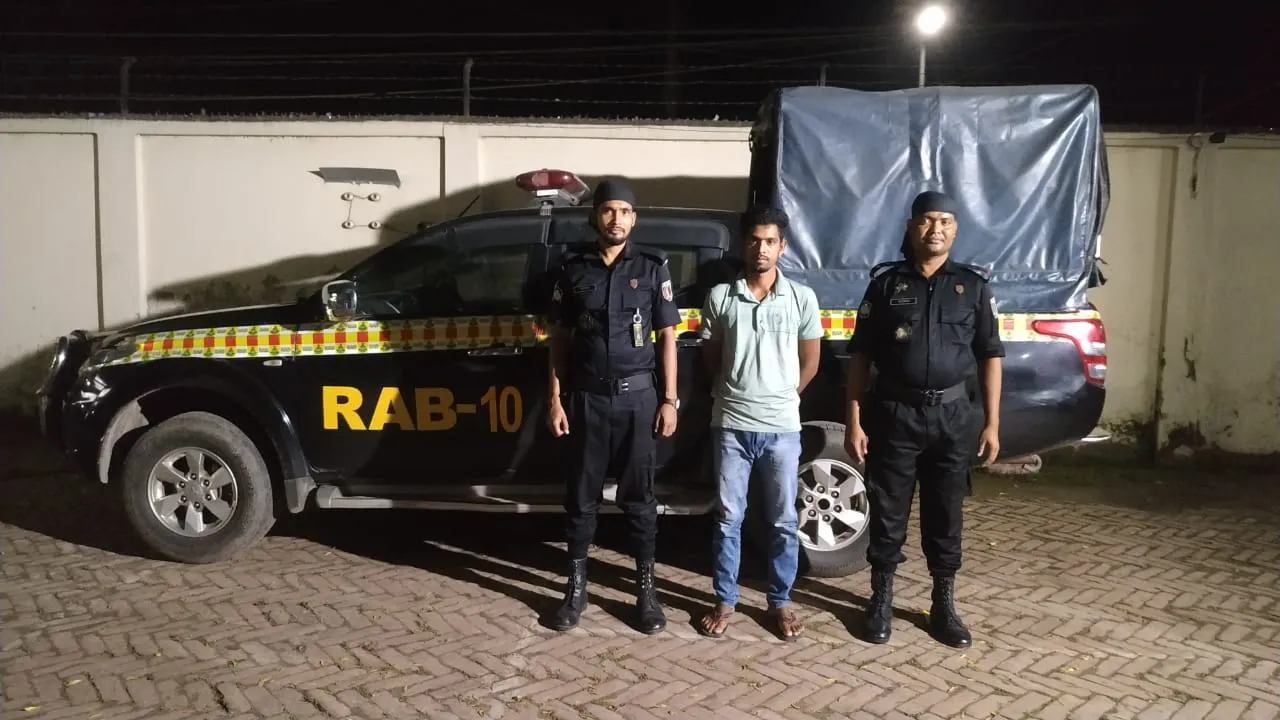 গতকাল ১০ অক্টোবর ২০২৩ খ্রিঃ তারিখ আনুমানিক রাত ১৯:৩০ ঘটিকায় র্যাব-১০ এর একটি আভিযানিক দল গোপন সংবাদের ভিত্তিতে ফরিদপুর জেলার কোতয়ালী থানাধীন বাখুন্ডা রেলস্টেশন এলাকায় একটি অভিযান পরিচালনা করে। উক্ত অভিযানে ফরিদপুর জেলার বোয়ালমারী থানার মামলা নং-০৫/২০০, তারিখ-০৫/১০/২০২৩ খ্রিঃ, ধারা- নারী ও শিশু নির্যাতন দমন আইন ২০০০ (সংশোধনী ২০০৩) এর ১১(ক)/৩০। যৌতুকের জন্য স্ত্রী হত্যা মামলার প্রধান আসামি হত্যাকারী মোঃ হাচান শেখ(২৮), পিতা- মোঃ ইউনুচ শেখ, স্থায়ী ঠিকানা- জয়পাশা, থানা- বোয়ালমারী, জেলা- ফরিদপুর’কে গ্রেফতার করে।